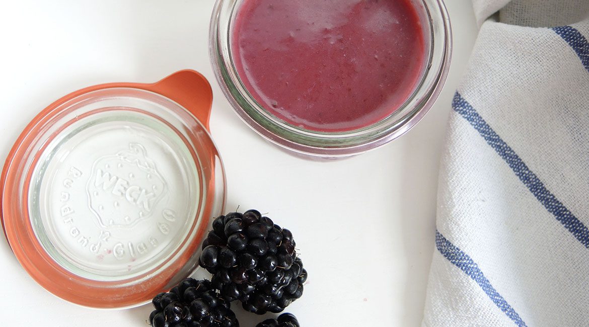 Jetzt sind sie reif, die großen dunklen, glänzenden Brombeeren. Bereits beim Pflücken möchte ich schon alle vernaschen. Zum Glück gibt es im Garten meines Onkels so viele, dass es doch noch ein paar in meine Küche geschafft haben. Dort treffen die kleinen Früchte auf eine gschmackige Bauernbutter, Bio-Eier und Zucker. Das Ergebnis ist ein cremiger Brombeeraufstrich. Lemon Curd, das Original aus Großbritannien, kennen vielleicht einige von euch. Aber anstatt der Zitrone eignen sich Brombeeren genauso und ich sage euch: dieser Moment, wenn ihr als allererstes die Frucht schmeckt und langsam kämpft sich der volle Buttergeschmack durch … es ist ein Traum 🙂 Aber was zusätzlich anzumerken ist: Die Brombeere ist eine starke Heilpflanze, die stopfend, reinigend, blutdrucksenkend und entzündungshemmend wirkt – was übrigens auch wissenschaftlich bewiesen ist.